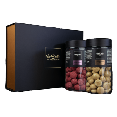 Luxe en premium cadeaus met twee potjes gechocolateerde kruidnoten in een hardcover zwarte giftbox.