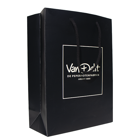 Alles is verpakt in een stevige papieren tas met een handvat van zwart touw, ideaal voor een stijlvol geschenk.