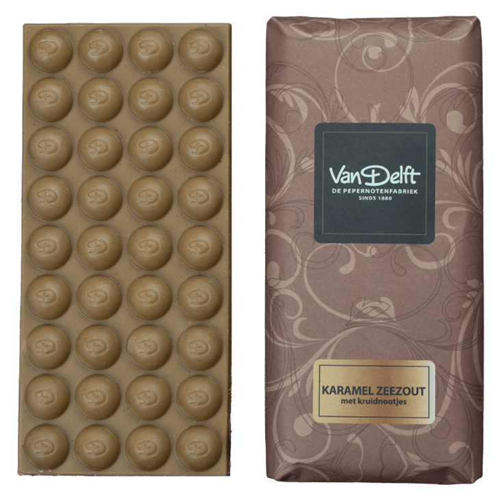 Heerlijke luxe Van Delft chocoladerepen gevuld met krokante pepernoot stukjes. Deze combinatie moet je proberen en is uniek bij Van Delft verkrijgbaar.